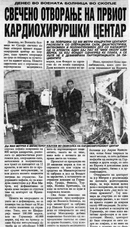 На 1 март 2000 година официјално започнува со работа болницата, а е изведена и првата бај-пас операција во државата, предводена од академик д-р Жан Митрев – историски момент за македонското здравство.