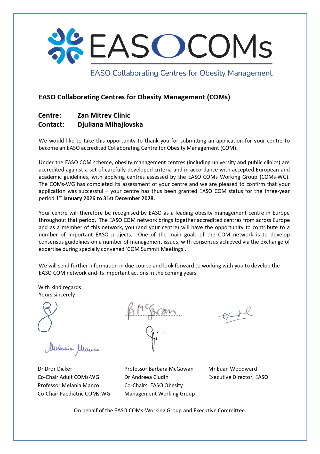 Центарот за менаџмент на обезност (дебелината) при Клиника Жан Митрев се стекна со престижниот статус EASO Collaborating Centre for Obesity Management (COM) и е официјално акредитиран од Европската асоцијација за проучување на обезноста (EASO) за периодот 2026–2028 година, со што станува признат како водечки центар за третман на обезност на европско ниво. Оваа акредитација претставува највисоко европско признание во областа на третманот на обезноста и се доделува исклучиво на центри кои ги исполнуваат најстрогите медицински, научни и организациски критериуми, во согласност со европските и академските клинички упатства. Процесот на акредитација вклучува темелна евалуација од страна на EASO COM Working Group, која ја потврдува клиничката извонредност, мултидисциплинарниот пристап и долгорочната грижа за пациентите.