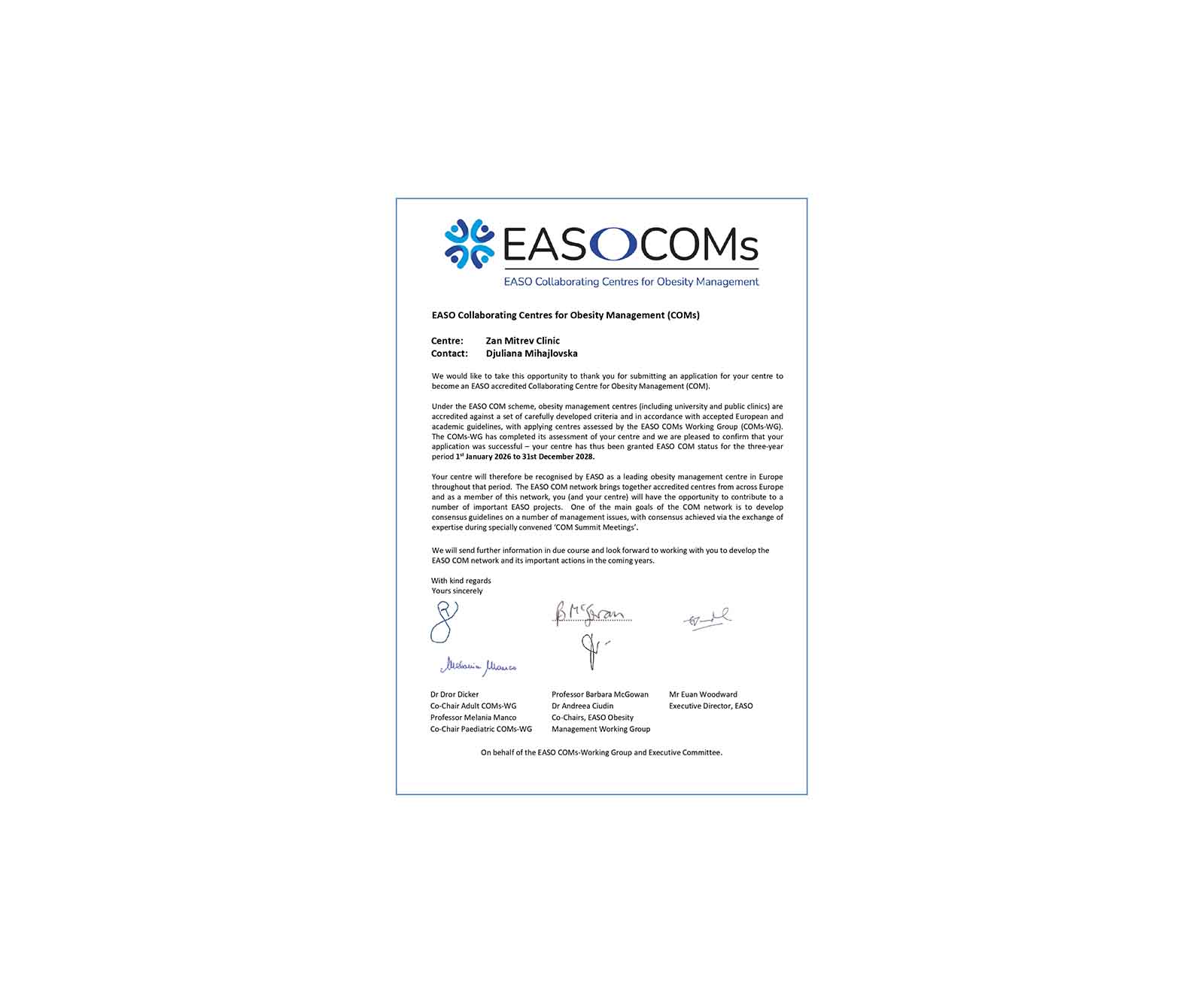 EASO COM акредитацијата е директна гаранција за пациентите дека третманот на обезност во Клиника Жан Митрев се спроведува според највисоки европски стандарди и носи конкретни придобивки: лекување и примена на валидирани клинички протоколи, структуриран пациентски пат и континуирано следење на резултатите. Овозможува пристап до најновите научни достигнувања и современи терапии преку вклученост во европски експертски мрежи, размена на знаења и имплементација на најнови терапевтски пристапи во третманот на обезноста, како и соработка со врвни европски медицински центри во EASO COM мрежата, во креирање европски консензус-насоки и заеднички стручни иницијативи.